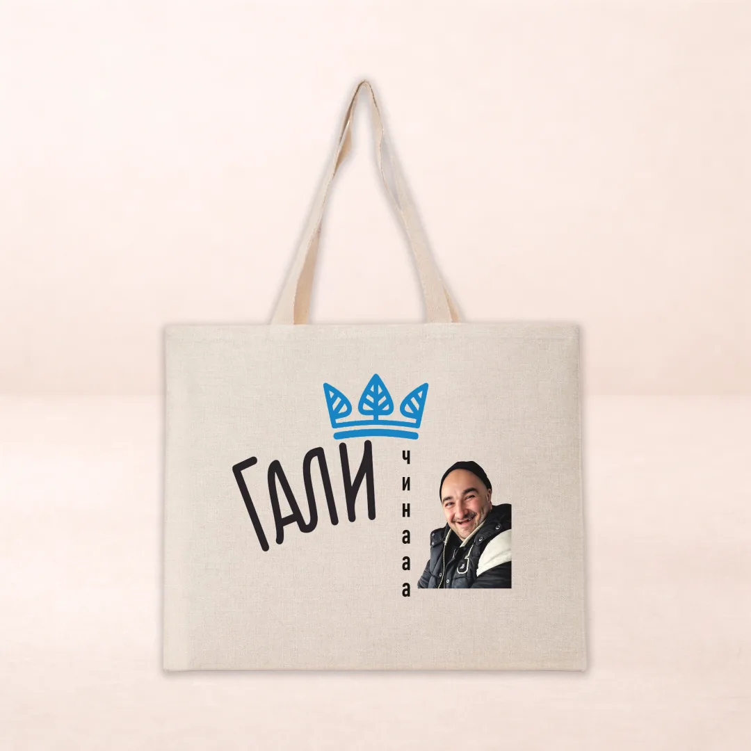 Персоналізована еко-сумка шопер з унікальним принтом у стилі «Галичина» — з блакитною короною, авторським написом і фотографією на ваш вибір. Ідеальний подарунок для справжнього галичанина або людини, яка пишається своїм регіоном.