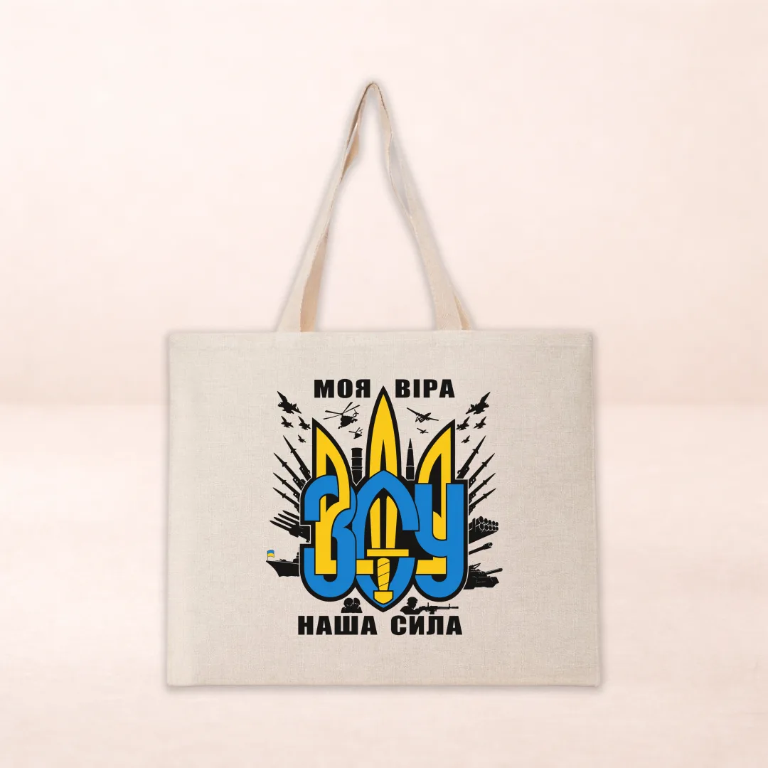 Патріотична еко-сумка шопер з авторським принтом «Моя Віра — ЗСУ. Наша Сила» — стильний і практичний аксесуар для тих, хто пишається Збройними Силами України та підтримує їх щодня.