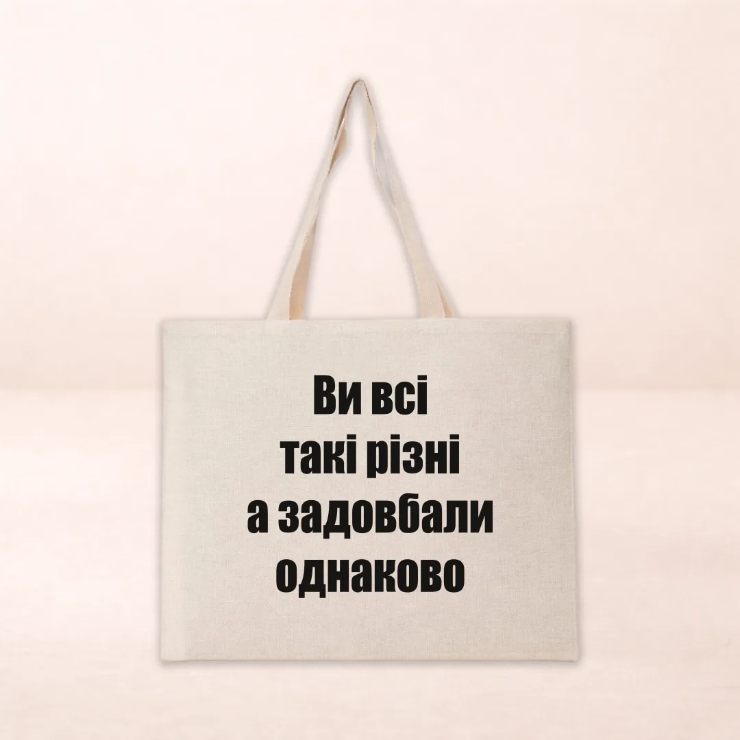 Еко-сумка шопер з кумедним написом «Ви всі такі різні, а задовбали однаково» — ідеальний вибір для тих, хто цінує гумор і не боїться висловлювати своє ставлення до оточуючих з посмішкою.