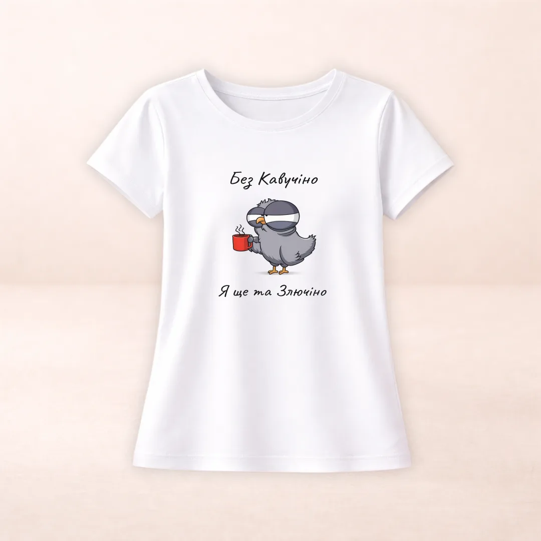 Дизайн із кумедним персонажем та жартівливим написом передає знайомий стан без кави — коли настрій “ще той”. Такий принт додає гумору образу та чудово підходить для повсякденного носіння.