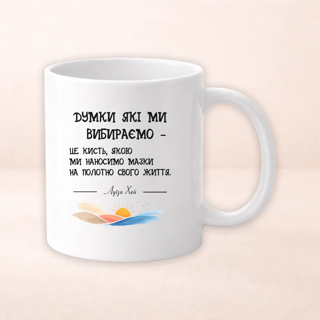 Ця чашка з глибоким життєвим посланням «Думки, які ми вибираємо — це кисть, якою ми наносимо маски на полотно свого життя» від Луїзи Хей стане чудовим подарунком для тих, хто шукає натхнення і хоче змінити своє ставлення до життя. З яскравим рожевим кольором ручки і внутрішньою частиною чашка привертає увагу і додає тепла та емоцій в кожен день. Ідеально підходить для чаю, кави або гарячих напоїв, а також для тих моментів, коли хочеться поринути в роздуми і надихнутися позитивом.