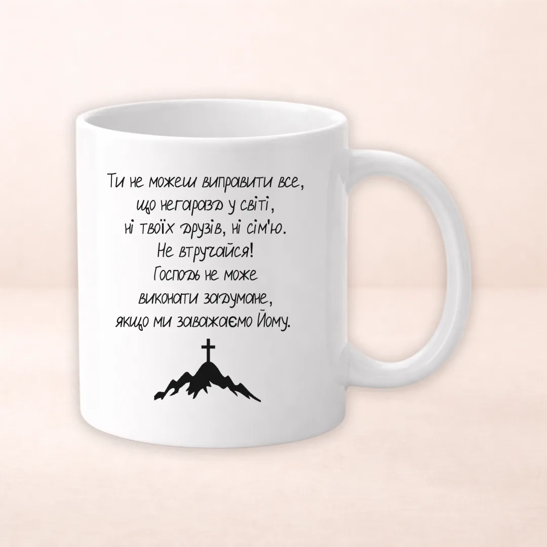Ця чашка з двома глибокими цитатами є відмінним подарунком для тих, хто шукає підтримку та натхнення в своєму житті. Принт «Передай себе в руки Божі» нагадує про важливість віри та віддачі у руки Божі в моменти складнощів. Цитата «Ти не можеш виправити все, що негарно у світі...» додає надії і наголошує на тому, що ми не можемо змінити все навколо, але можемо знайти спокій, довірившись Господу. Ідеальна для людей, які шукають спокій, віру та надію в кожен день.
