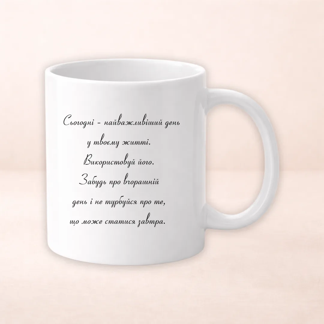 Ця чашка з двома чудовими цитатами стане чудовим мотиватором на кожен день. Принт «Тільки сьогодні» нагадує про важливість цінувати момент і не відкладаючи справи на завтра. А інший принт «Сьогодні — найважливіший день у твоєму житті...» надихає максимально використати кожну мить. Це ідеальний подарунок для людей, які хочуть жити тут і зараз, відчувати себе більш зосередженими на поточному моменті. Візьміть чашку з собою на роботу або подаруйте другу, щоб підтримати позитивний настрій та натхнення.