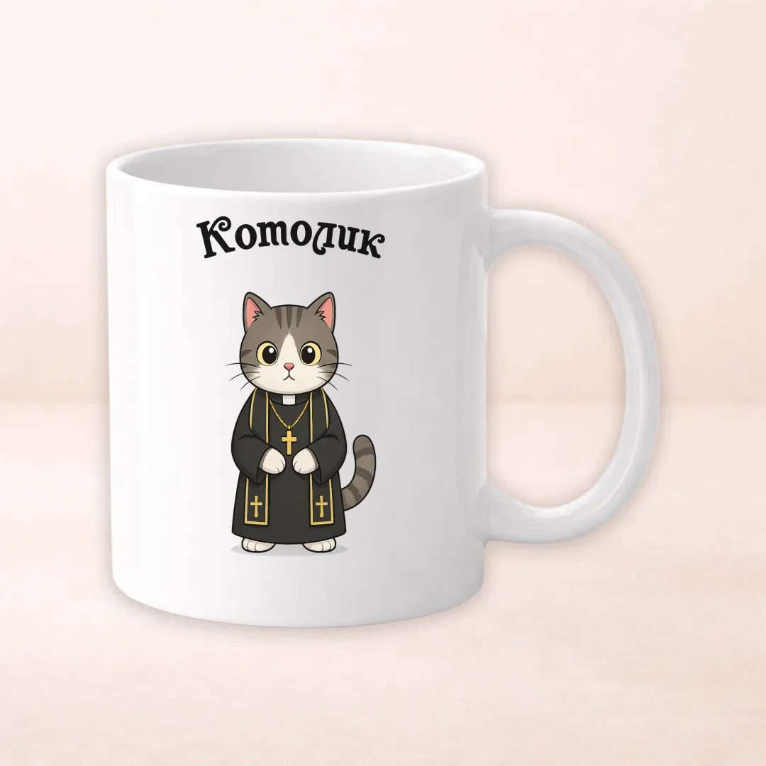 Оригінальна чашка з мемним християнським принтом «Котолик» — це поєднання гумору, стилю та духовного змісту. Дизайн із милим котиком у священницькому вбранні створює унікальний баланс між легкістю мемів і символічністю віри. Такий принт точно не залишиться без уваги та викликатиме усмішку щодня.