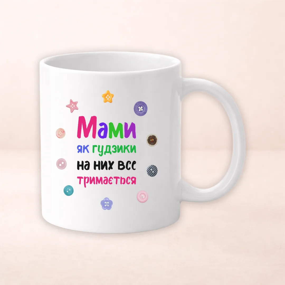Чашка з ніжним написом «Мами як ґудзики — на них все тримається» — це символ турботи, підтримки та безмежної любові.