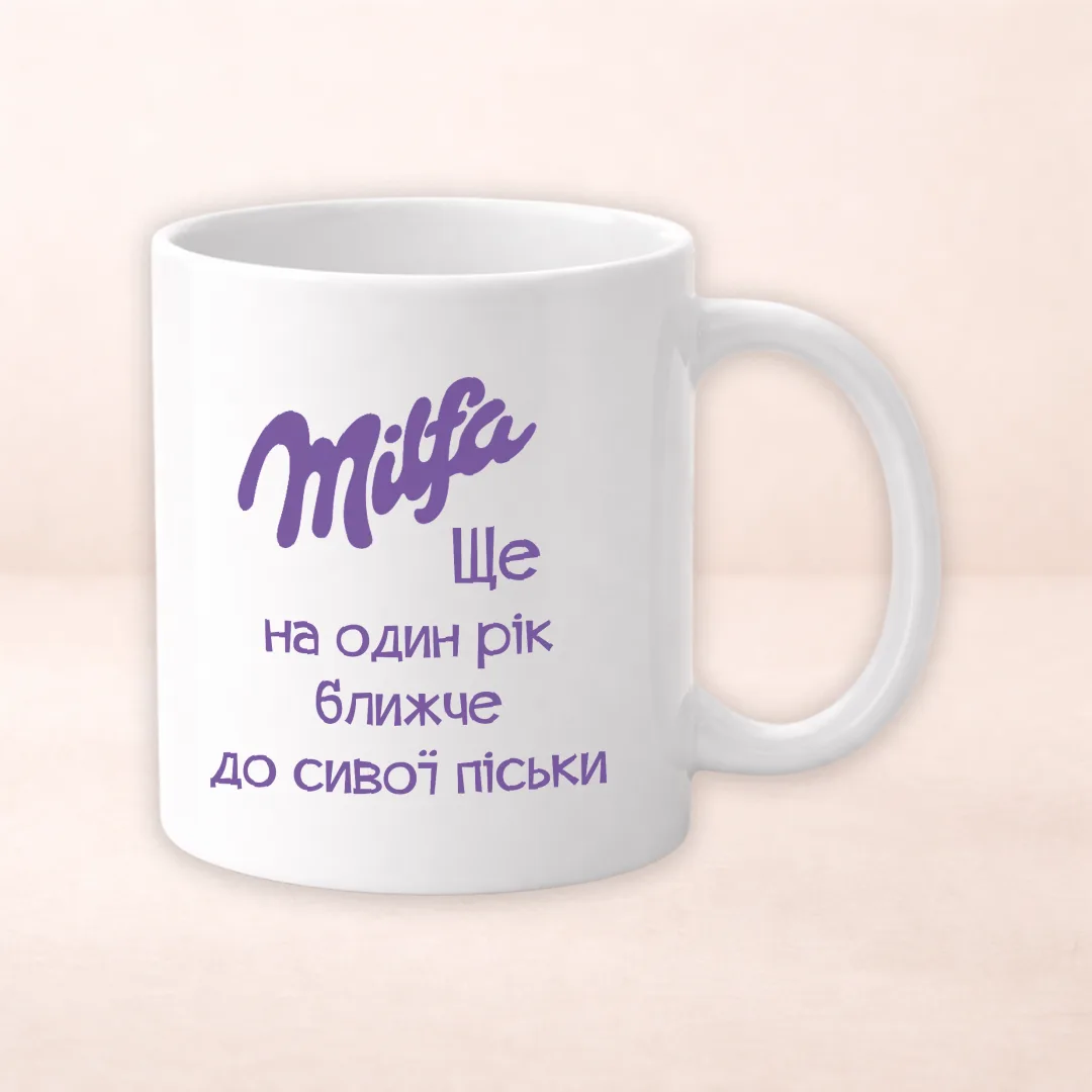 Чашка з принтом «Milfa - ще на один рік ближче до сивої піськи» — сміливий і небанальний варіант для щоденного користування або оригінального подарунка. Такий дизайн сподобається тим, хто цінує провокативний дорослий гумор та любить оригінальні речі з характером. Принт виглядає виразно, додає настрою та підкреслює індивідуальність. Сміливий гумор додає дизайну дорослого настрою та робить подарунок по-справжньому небанальним.