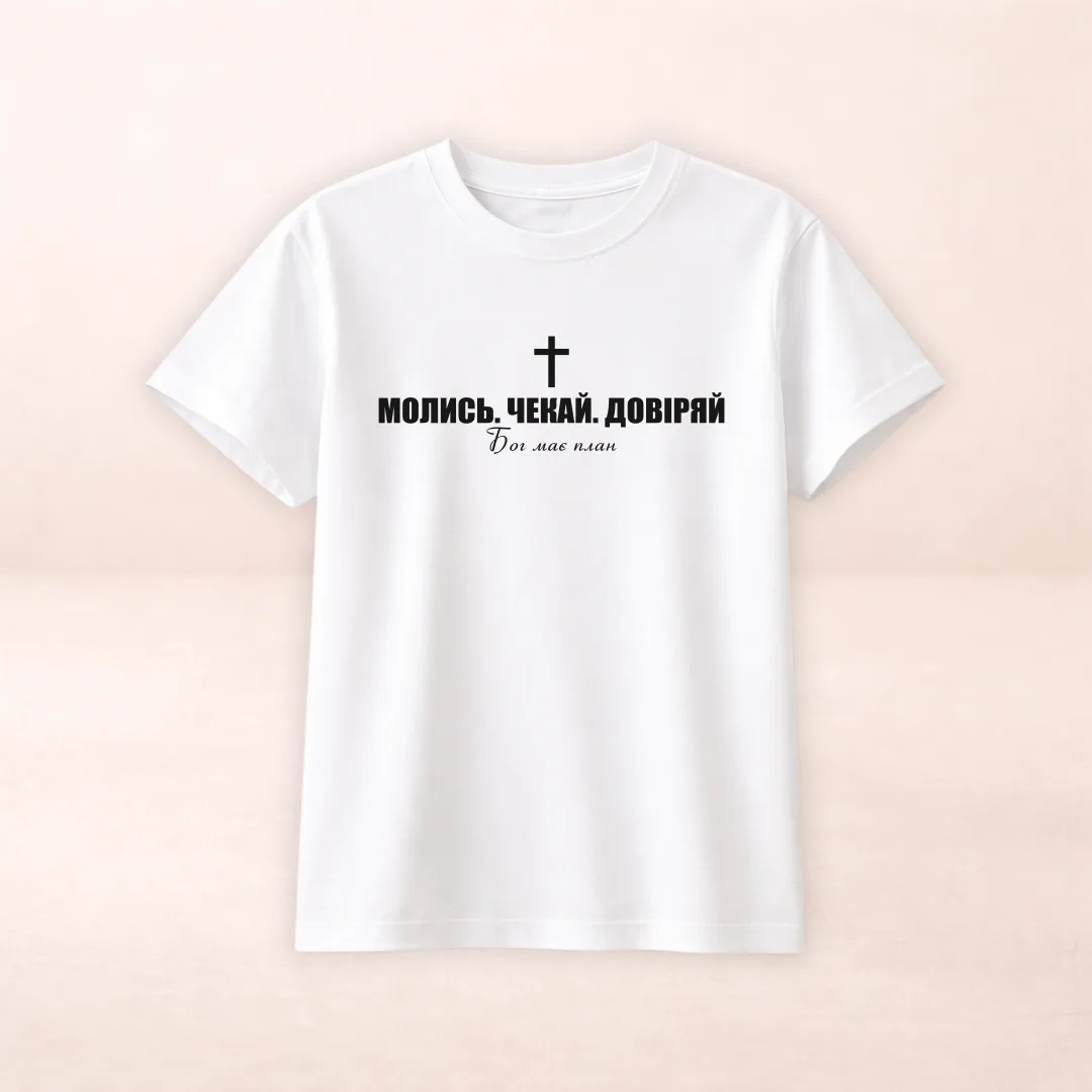 Стильна футболка з християнським змістом — це не просто елемент гардеробу, а спосіб висловити свою віру та внутрішню силу. Лаконічний дизайн із хрестом та надписом «Молись. Чекай. Довіряй. Бог має план» несе глибокий сенс і щоденне нагадування про довіру до Божого задуму.