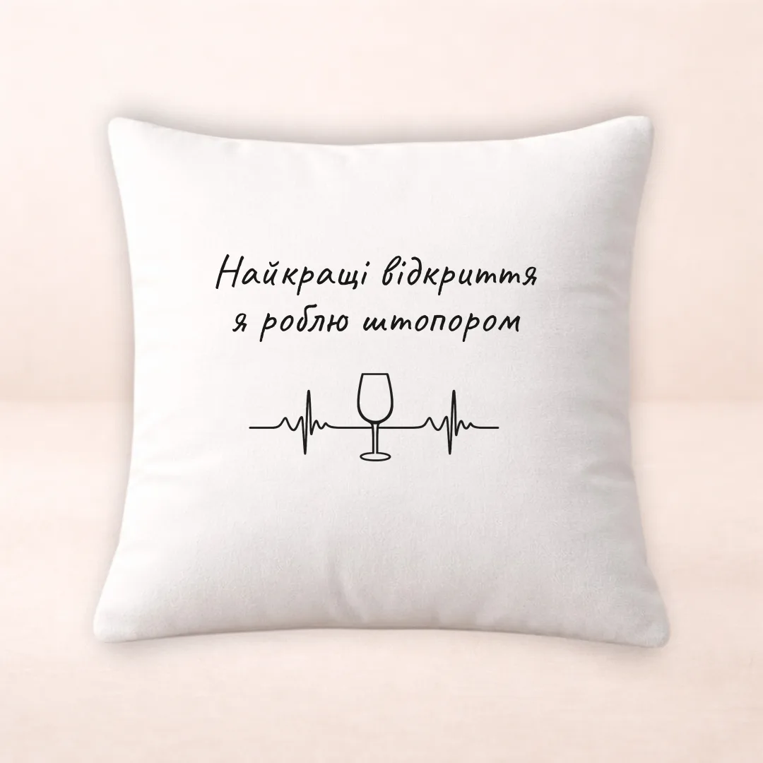 Декоративна подушка з принтом «Найкращі відкриття я роблю штопором» — затишна деталь інтер’єру, яка додає простору тепла, емоції та індивідуальності. Такий дизайн особливо сподобається людям із почуттям гумору. Кумедний або сміливий напис робить річ помітною та легко впізнаваною. Сміливий гумор додає дизайну дорослого настрою та робить подарунок по-справжньому небанальним.