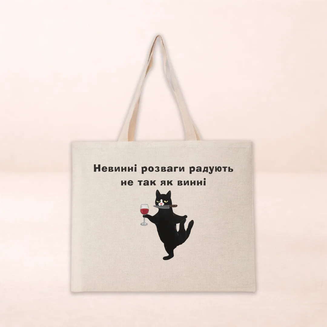 Шопер з принтом «Невинні розваги радують не так як винні» — практичний аксесуар на щодень, який поєднує зручність, настрій і помітний дизайн. Такий дизайн особливо сподобається тим, хто любить меми, самоіронію та помітні написи. Влучний напис одразу привертає увагу, викликає усмішку й добре читається в повсякденному використанні. Лаконічний, але помітний напис робить аксесуар доречним і для міського ритму, і для повсякденних покупок.