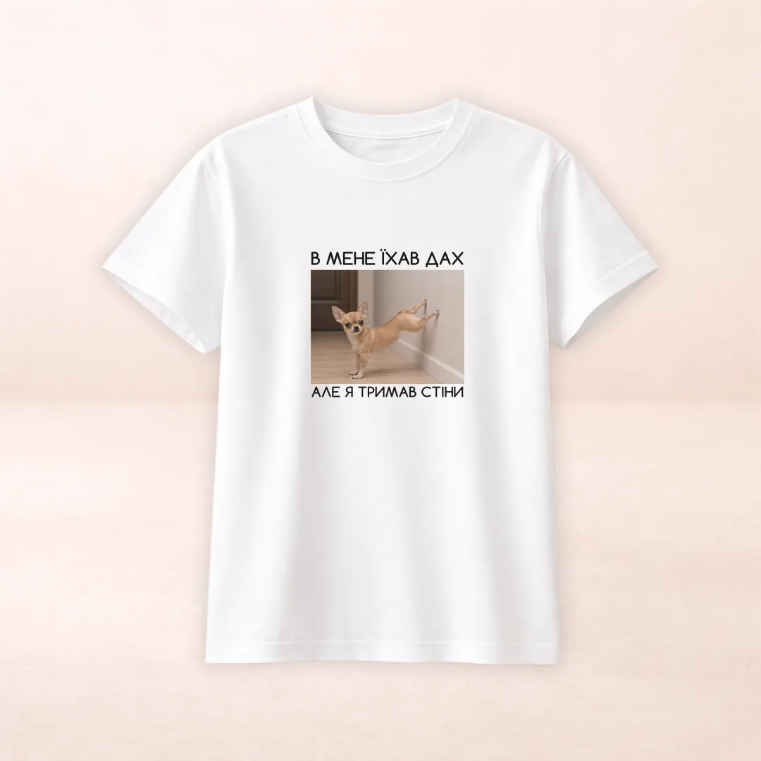 Стильна футболка з вірусним мемним принтом — ідеальний вибір для тих, хто цінує гумор і любить трендові речі. На принті зображено кумедного песика, який буквально «тримає стіну», доповнений написом «В мене їхав дах, але я тримав стіни». Такий дизайн гарантовано викликає усмішку та привертає увагу.